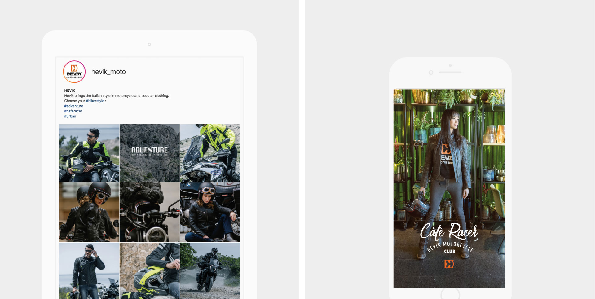 Ogni intervento è stato pensato per rafforzare la suddivisione dei prodotti Hevik secondo il contesto di utilizzo (Urban, Adventure, Café Racer) tramite lo studio di nuovi logotipi, colori, texture, mood fotografico e preset fotografici per Instagram identificativi di ciascuno dei tre mondi. L’utilizzo di immagini e grafiche declinate in base al contesto fa immedesimare l’utente nel mondo a cui appartiene ogni prodotto.