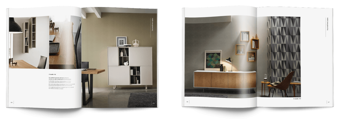 Quando si parla di casa è fondamentale trasmettere emozioni attraverso le immagini: per i cataloghi delle linee Living e Notte abbiamo scelto di rappresentare le possibili ambientazioni per far percepire immediatamente le potenzialità dei prodotti. L’aspetto emozionale è stato valorizzato da un’impaginazione molto pulita ed essenziale, approccio che ha ispirato anche lo sviluppo del sito web.